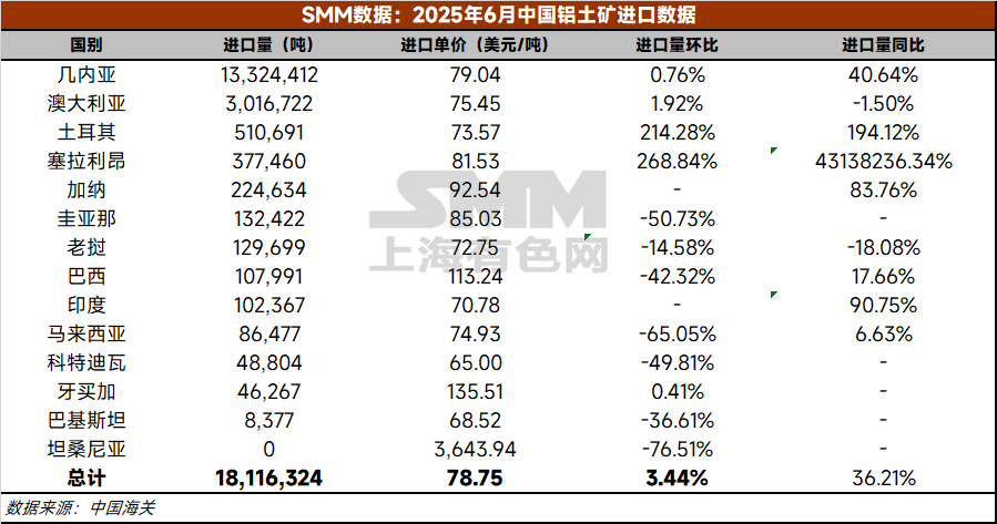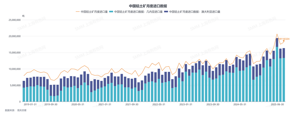 据中国海关总署, 2025年6月中国进口铝土矿1811.6万吨,环比增加3.44%,同比增加36.21%。2025年1-6月,中国累计进口铝土矿10340万吨,同比增加34%。