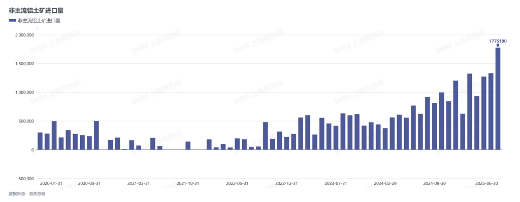 2025年6月有来自土耳其、塞拉利昂、加纳、圭亚那、老挝等12个国家的进口铝土矿,合计累计进口177.5万吨,同比增加132.4%,占进口总量的7.02%。非主流铝土矿供应总量屡创近五年新高,成为国内铝土矿供应的重要补充。但目前为止,非主流进口铝土矿仍然主要用作配矿。