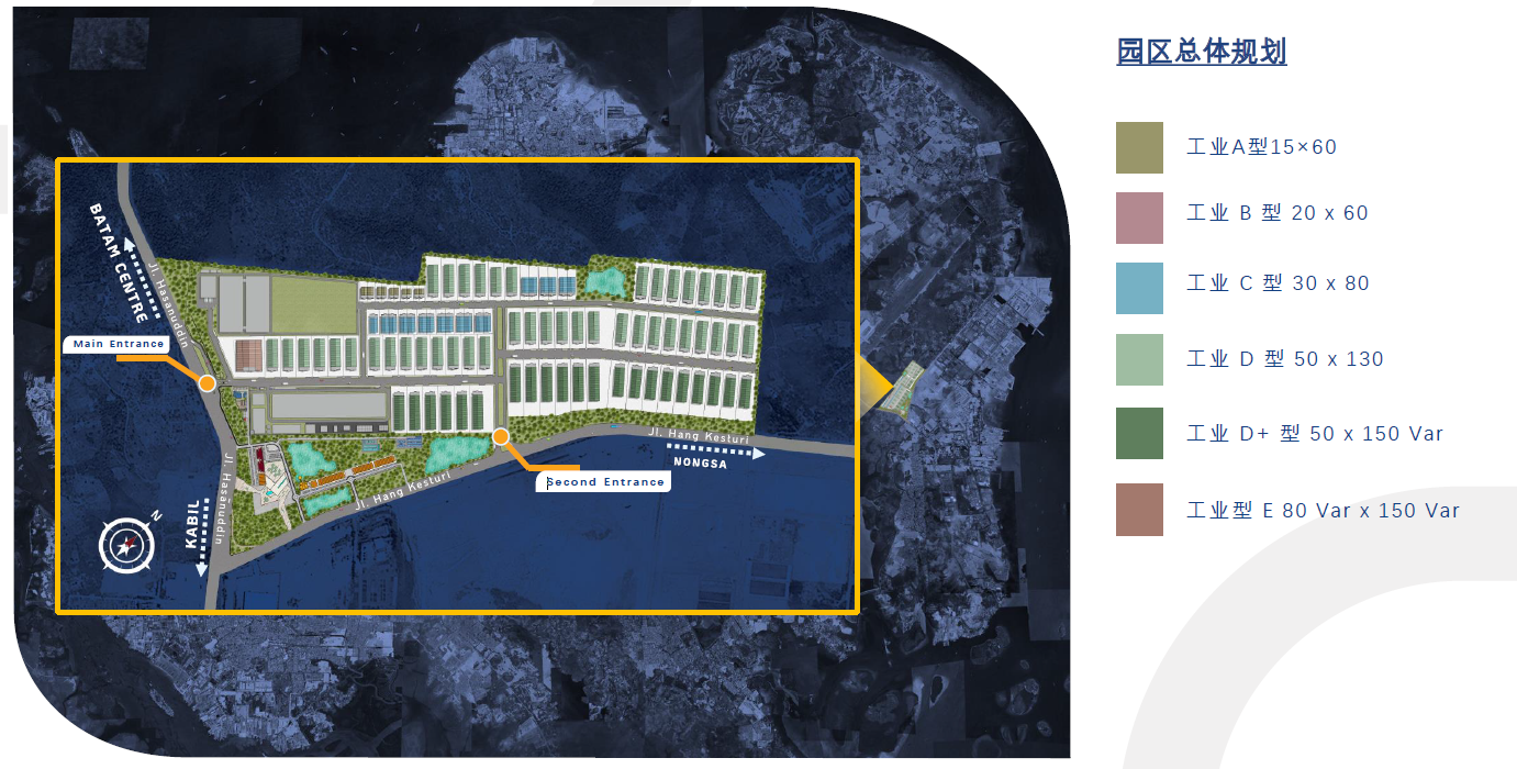 来自 Hasanuddin路和 Hang Kesturi路的多个通道。园区配备宽阔的道路,支持工业车辆的通行,主干道宽度46m 和33m,次干道宽度为25m。
