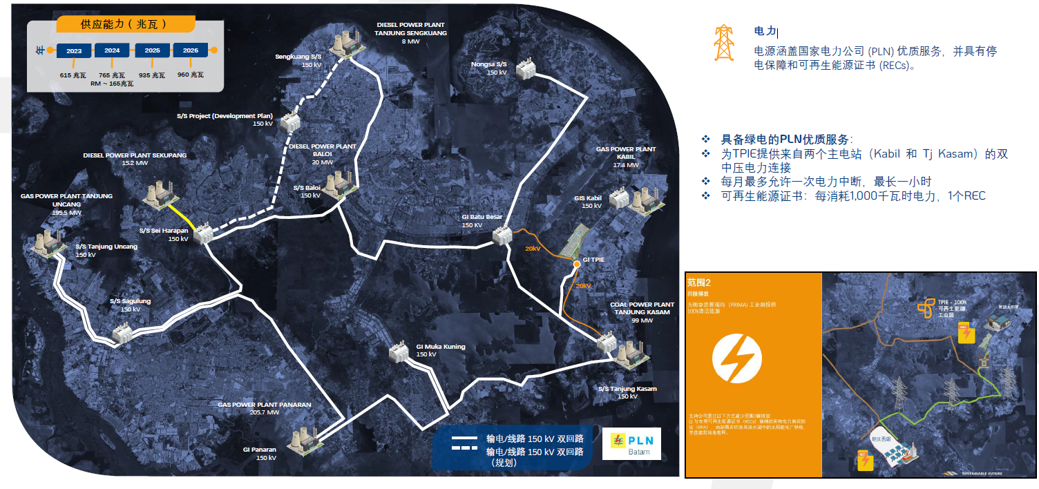 来自巴淡岛自来水供应系统(SPAM) 的现成供应,由图拿思普瑞玛工业园(Prima) 分配。