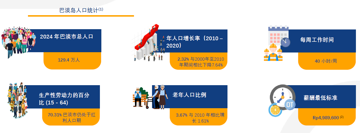 巴淡岛可提供大量劳动力。巴淡岛的劳动力成本比新加坡便宜3.5 倍。