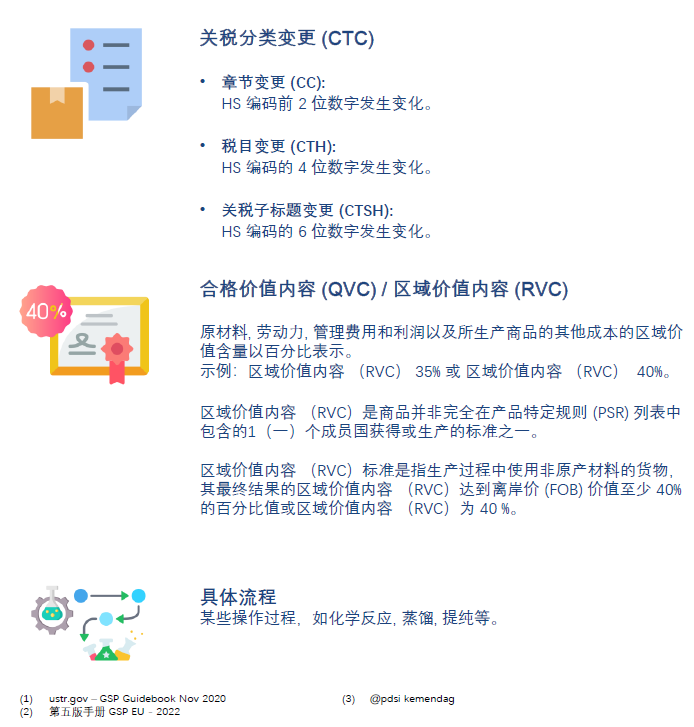 •美国认为印度尼西亚, 柬埔寨, 菲律宾, 缅甸和泰国是符合普惠制原产地规则要求的一体化区域。来自这组区域累积的制造成本可以用来实现区域价值内容(RVC) 目标。