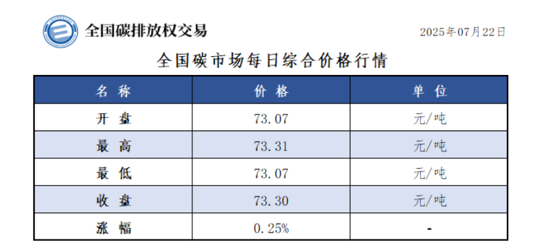 今日全国碳市场综合价格行情为: 开盘价73.07元/吨,最高价73.31元/吨,最低价73.07元/吨,收盘价73.30元/吨,收盘价较前一日上涨0.25%。