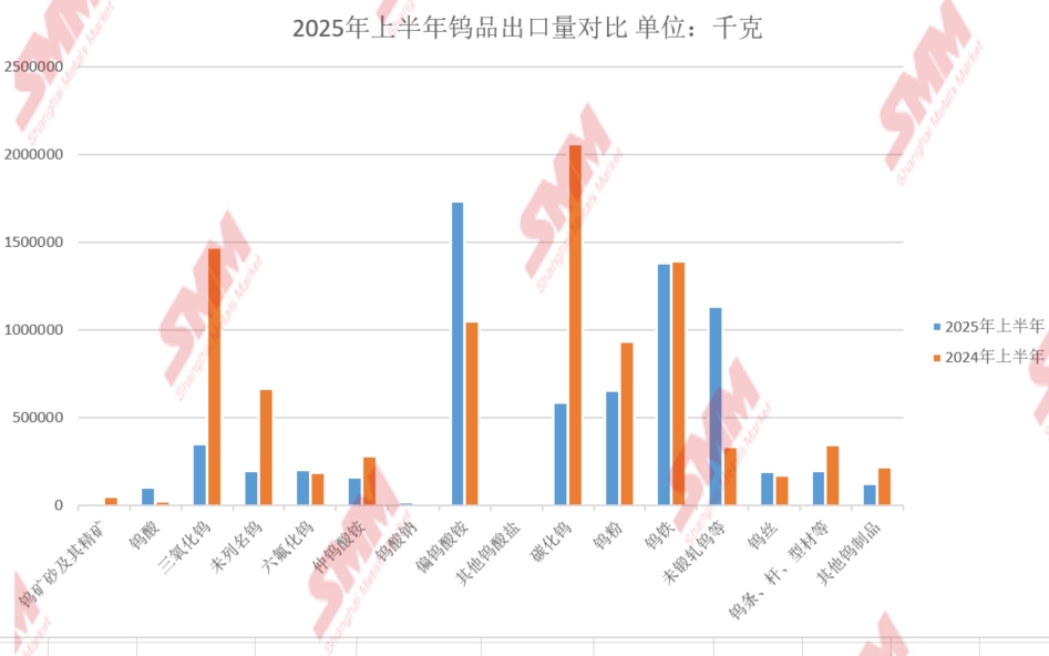 2025 年上半年,中国钨品出口市场在政策调控与国际供需博弈中呈现显著结构性变化,国内钨初加工产品出口总量收缩、高附加值产品出口总量增加,国内钨进出口贸易结构进一步升级。以下从进出口数据分别就上半年钨进出口市场简析: