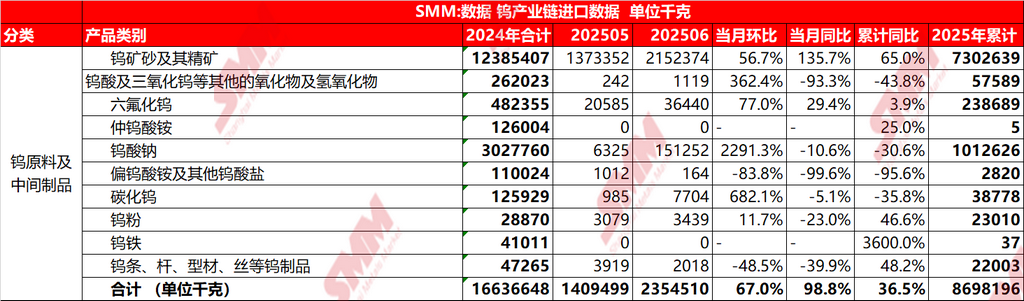 进口数据:据海关数据显示,2025年6月国内钨精矿及中间钨制品产品进口总量约为2354.5吨,环比增长76%,同比增长98.8%,2025年上半年钨精矿及中间钨制品产品进口总量约为8698.2吨,同比增长36.5%。累计进口金额为10.70亿元,同比增长36.50%。