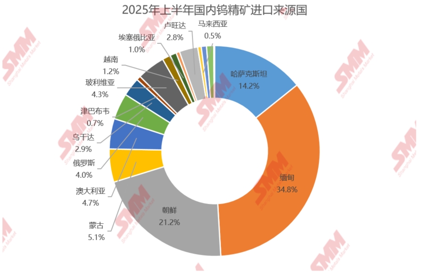 其中钨精矿进口增量明显,6月份钨精矿进口同比增长135.7%至2152.4吨左右,2025年上半年钨精矿总进口量达7302.6吨,同比增长65%。从钨精矿进口来源国来看,5-6月份国内进口来源哈萨克斯坦钨精矿增量较为明显,其中6月份国内进口哈萨克斯坦钨精矿总量866吨,赶超缅甸成为国内钨精矿进口来源第一国,2025年上半年进口哈萨克斯坦矿总量约为1040吨左右,占国内进口总量的14.2%,收货地区主要为江西地区。主因哈萨克斯坦巴库塔钨矿项目已于25年上半年释放钨精矿产品,据相关信息显示,巴库塔矿一期项目设计日处理矿石量1万吨,年处理能力330万吨;二期项目计划于2027年初投产后,通过配置矿石分选系统,年处理能力将提升至495万吨。该项目计划在当地建立APT等下游冶炼工厂,预计在下游冶炼厂建成投产之前,哈萨克斯坦矿将成为国内主要进口钨精矿来源。除此之外,2025年上半年国内钨精矿进口来源于缅甸总量约为2543.4吨,约战国内进口总量的34.8%。进口来源朝鲜的钨精矿总量约为1545吨,占进口总量的21.2%。