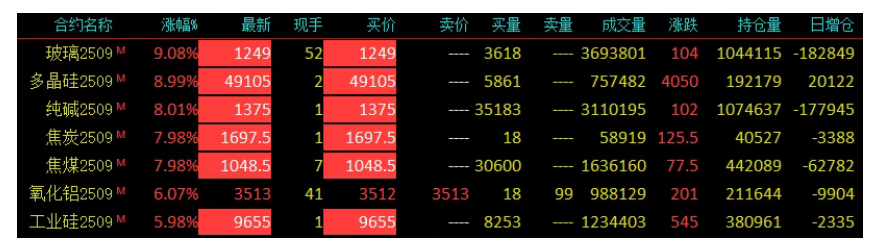 7月22日,国内大宗商品市场迎来罕见涨停潮。截至收盘,玻璃、纯碱、焦煤、焦炭、工业硅、多晶硅六大品种主力合约均强势封于涨停板。