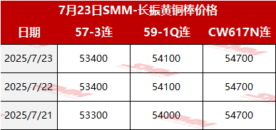 【SMM价格】2025年7月23日长振黄铜棒价格