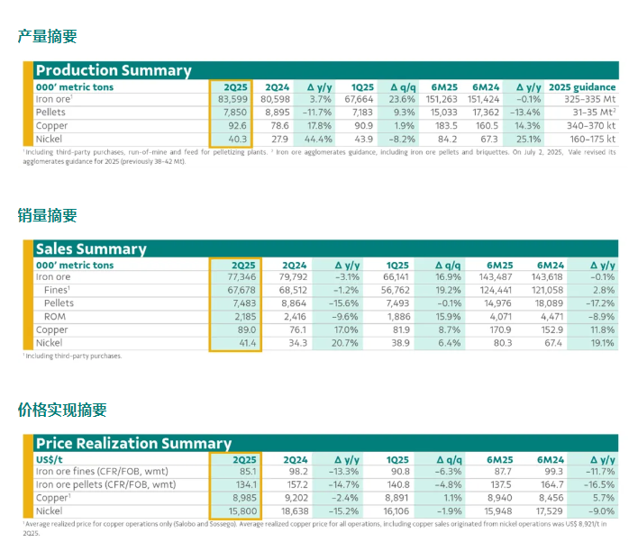 据淡水河谷消息:2025年第二季度,淡水河谷各项业务均表现稳健。铁矿石业务方面,新资产逐步增产,运营可靠性不断提升,这些将支持公司更顺利地完成2025年生产计划。镍和铜业务方面,持续的运营改进推动第二季度产量分别创下2021年和2019年以来的新高,进一步巩固了增长势头。今年6月,巴卡巴(Bacaba)项目取得重要进展,获得了初步许可。