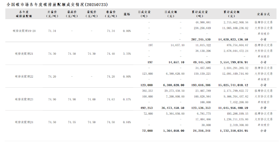 2025年1月1日至7月23日,全国碳市场碳排放配额成交量47,491,294吨,成交额3,546,911,235.64元。