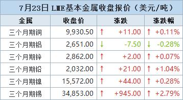 伦敦时间7月23日17:00(北京时间7月24日00:00),LME三个月期铜上涨11美元,或0.11%,收报每吨9,930.5美元,此前曾触及7月4日以来最高的9,947美元。