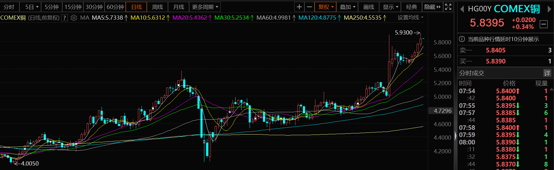 7月23日(周三),COMEX铜价上涨3.6%,至每磅5.93美元的创纪录水平,此前美国计划于8月1日开始对进口铜征收50%的关税。