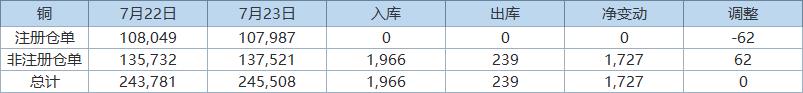 7月23日COMEX铜库存为245,508短吨,入库1,966短吨,出库239短吨,净增加1,727短吨,未作调整。