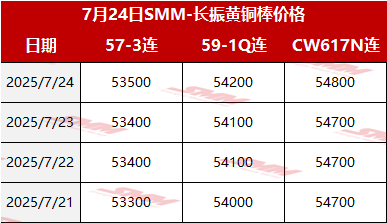 【SMM价格】2025年7月24日长振黄铜棒价格
