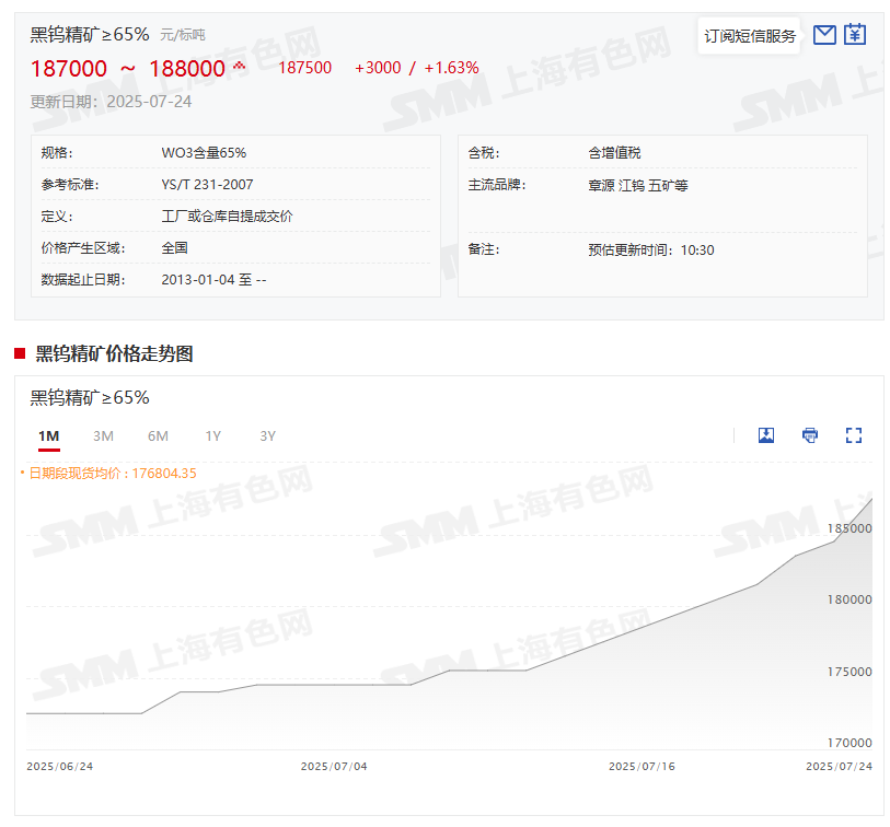 钨矿货源流通陷入紧俏态势,市场补库动作频频遇阻,原料端的稀缺带动钨价出现了连番上涨的行情,7月24日,SMM黑钨精矿(≥65%)价格为187000~188000元/标吨,其均价为187500元/标吨,这一均价与前一交易日上涨1.63%。对于钨的后市,短期来看,钨精矿在供应偏紧及战略资源属性的支撑下高位拉涨,带动钨产业链齐头上涨,但目前下游终端领域略有疲态,行业成交量较前期有所萎缩,市场转向谨慎,后市尚需关注需求释放情况。