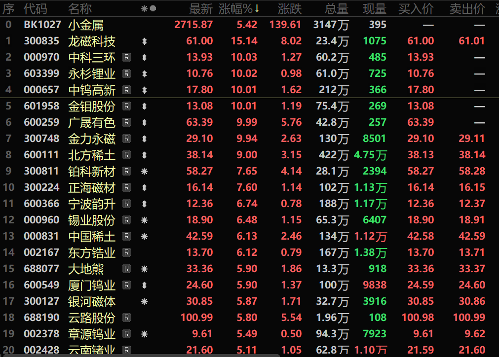 钨原料货源流通偏紧支撑钨价持续走强;北方稀土镨钕竞标价格7月23日上调后仍以“报警价即最高价”成交提振了市场信心,叠加多家磁材大厂的招标给稀土价格带来需求端口的支撑,带动稀土现货价格出现明显上涨;市场资金对战略资源的青睐等均带动小金属板块强势上涨,截至7月24日收盘,小金属板块涨5.42%,个股方面:中科三环、永杉锂业、中钨高新、金钼股份广晟有色涨停,龙磁科技涨超15%,金力永磁、北方稀土、铂科新材、正海磁材、宁波韵升、锡业股份、厦门钨业以及中国稀土等涨幅居前。