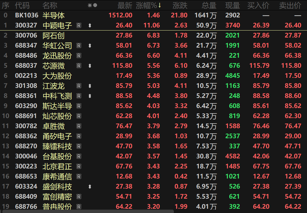 SMM 7月24日讯:近4个交易日,半导体板块接连上涨,7月24日日间指数盘中最高一度涨逾1.6%。个股方面,中颖电子盘中一度涨逾13%,阿石创、龙迅股份、华虹公司、江波龙等多股盘中一同涨逾5%。