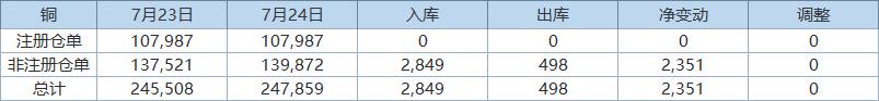 7月24日COMEX铜库存为247,859短吨,入库2,849短吨,出库498短吨,净增加2,351短吨,未作调整。