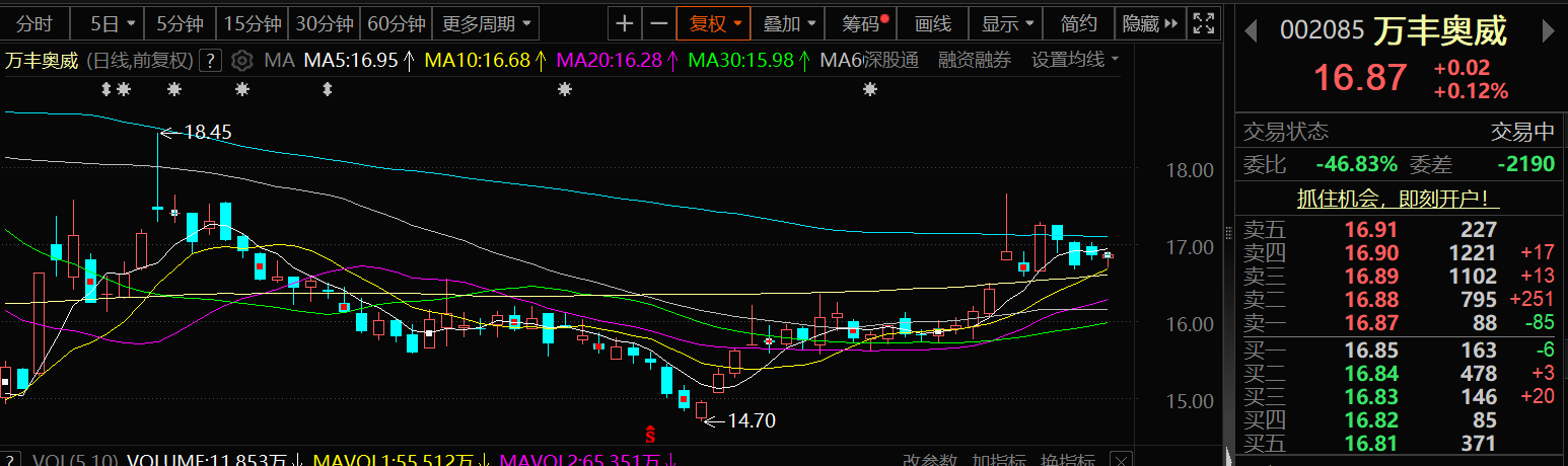 万丰奥威7月25日股价出现小幅上涨,截至9:59分,万丰奥威涨0.12%,报16.87元/股。