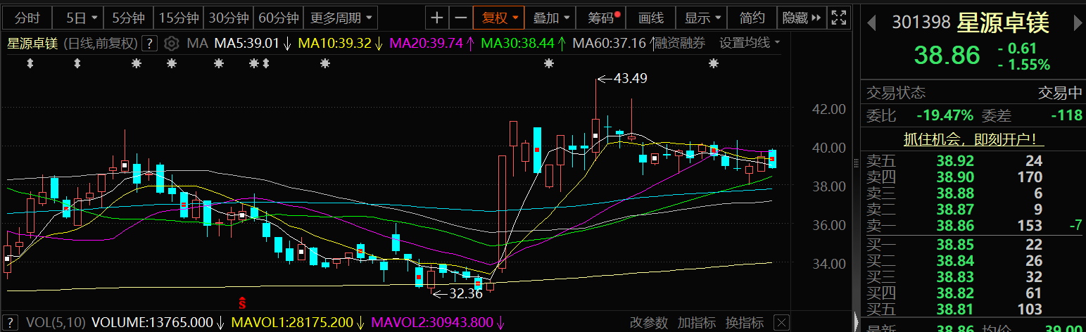 7月25日,星源桌镁股价出现下跌,截至25日10:42分,星源卓镁跌1.55%,报38.86元/股。