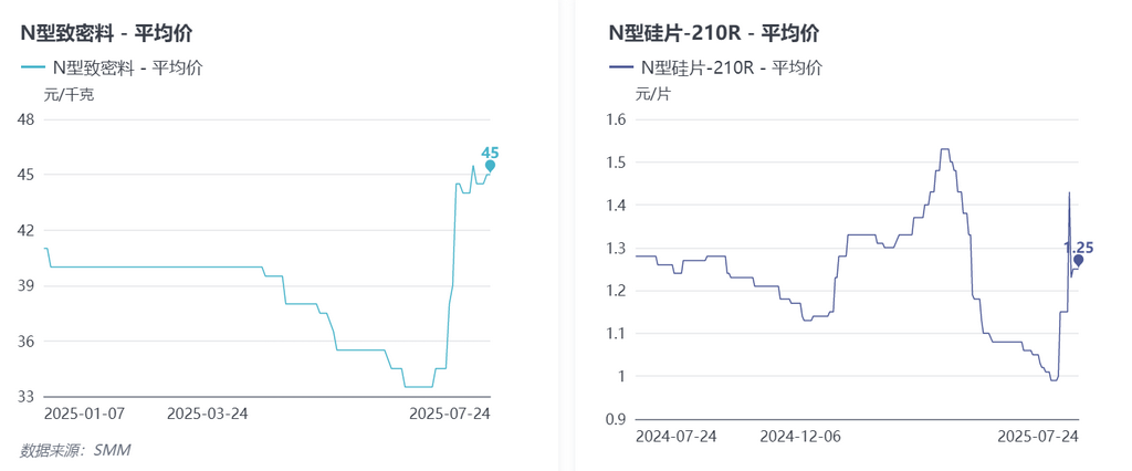 本周市场最显著的变化是183N电池片价格异动。受土耳其进口新政和中国出口新政预期的刺激,部分出口订单FOB价格飙升至0.3元/W以上,推动国内头部电池厂调整出货策略,优先满足海外需求。叠加国内183N产能持续缩减(部分厂商转向210RN生产),供应端进一步收紧,推动183N国内成交预期快速攀升至0.275元/W及以上,涨幅明显高于其他尺寸。根据SMM最新调研,截至8月,部分厂商的183N电池片订单已几近排满,暂时无扩产计划。截至发稿前,已有厂商的183N国内报价上涨至与FOB相同的0.3元/W。