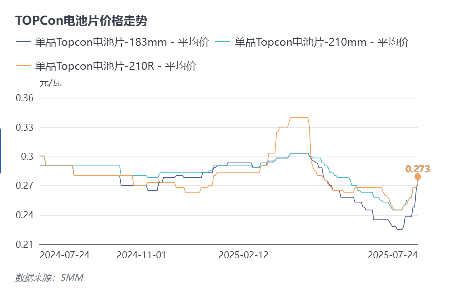 本周光伏电池片价格持续上涨,183N/210N/210RN尺寸TOPCon电池片成交价均来到0.27-0.275元/W。