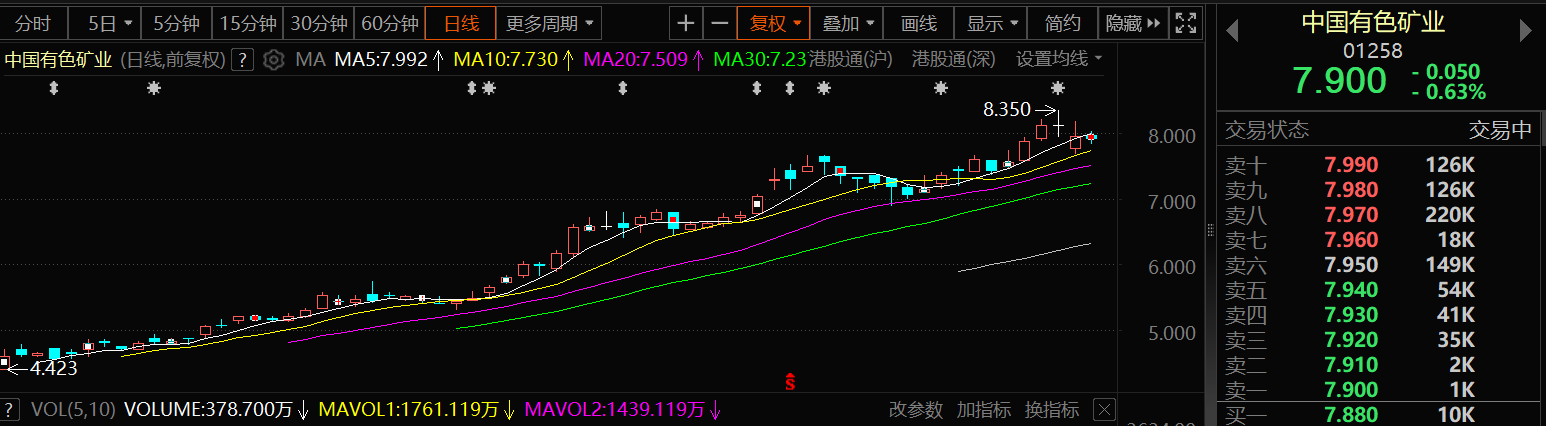7月25日,中国有色矿业的股价延续前一个交易日的跌势继续下行,截至25日11:10分,中国有色矿业跌0.63%,报7.9元/股。