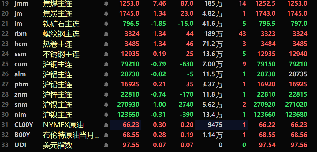 黑色系多飘红,铁矿跌1.85%,螺纹涨1.34%,热卷涨1.34%。不锈钢涨0.19%。双焦方面:焦煤主力合约延续前6个交易日的涨势继续大涨7.46%,焦炭期货主力合约涨1.34%。