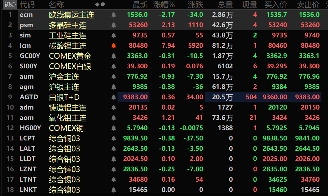 此外,铸造铝主连期货涨0.02%,氧化铝主连涨1.21%。碳酸锂主连涨7.94%,工业硅主连涨0.57%。多晶硅主连涨2.13%。