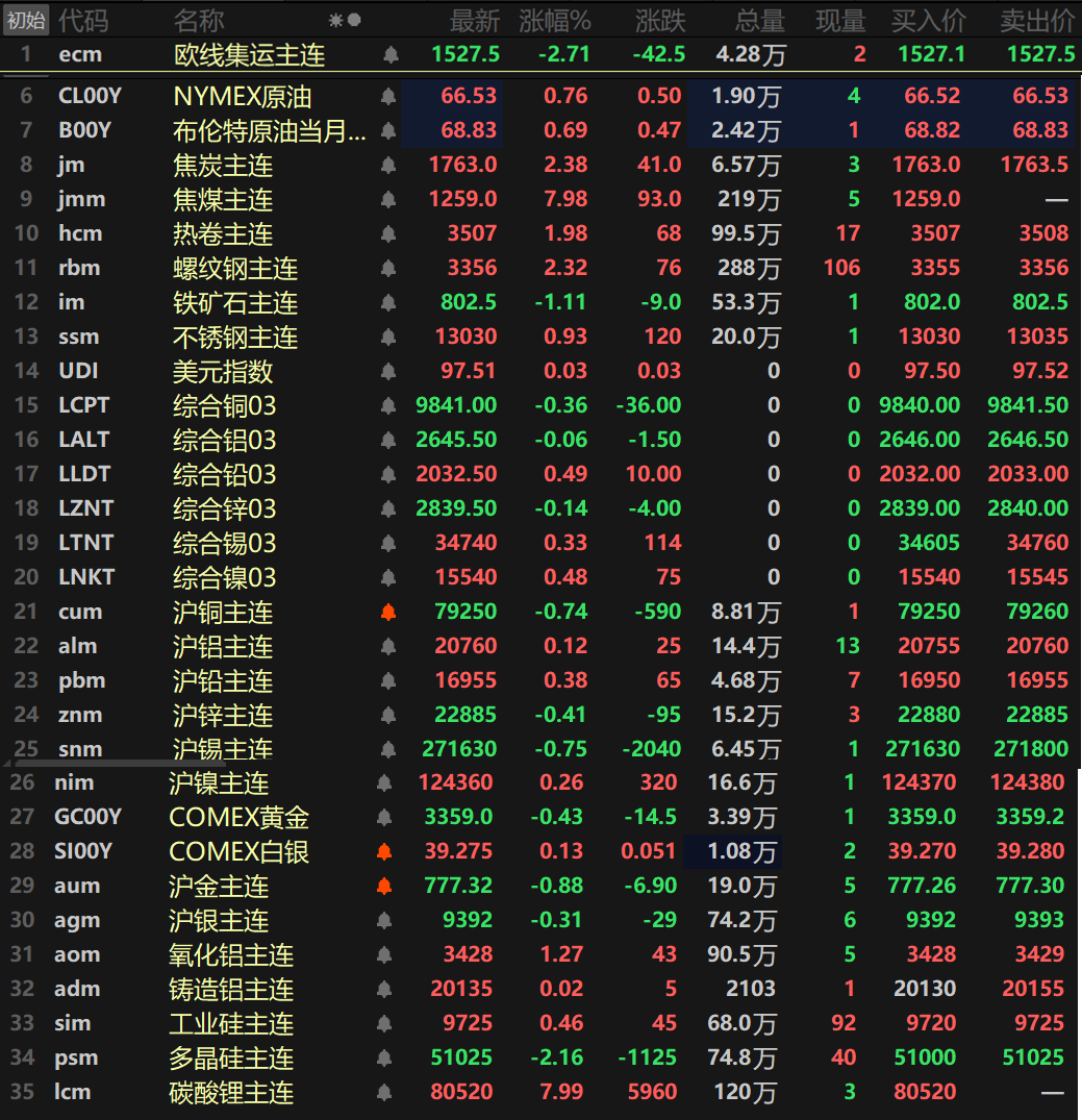 黑色系方面普涨,仅铁矿唯一下跌,跌幅达1.11%。热卷、螺纹一同涨逾1%,热卷涨1.98%,螺纹涨2.32%。双焦方面,焦炭涨2.38%,焦煤以7.98%的涨幅封死涨停板,录得四连板,报1259元/吨,刷2024年11月以来的新高。