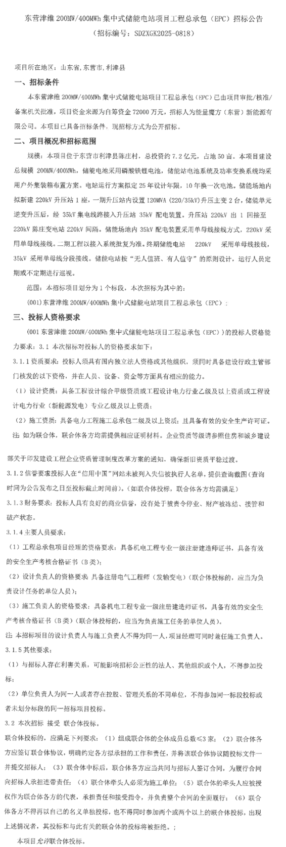 7月24日,能量魔方(东营)新能源有限公司发布东营津维200MW/400MWh集中式储能电站项目工程总承包(EPC)招标公告。项目资金来源为自筹资金72000万元,折合单价1.8元/Wh。