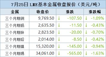 伦敦时间7月25日17:00(北京时间7月26日00:00),LME三个月期铜下跌107.5美元,或1.09%,收报每吨9,769.5美元。