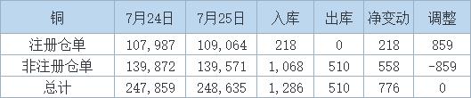 7月25日COMEX铜库存增加776短吨或0.31%,至248,635短吨,入库1,286短吨,出库510短吨,净调整0短吨。 COMEX铜库存变动情况如下(单位:短吨)