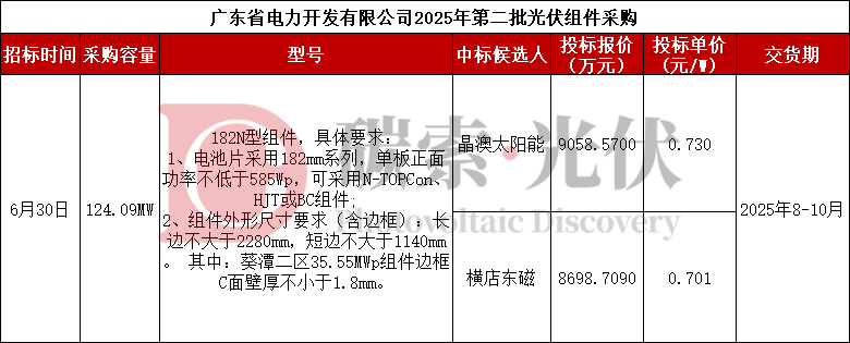7月26日,广东省电力开发有限公司2025年第二批光伏组件采购中标候选人公示。