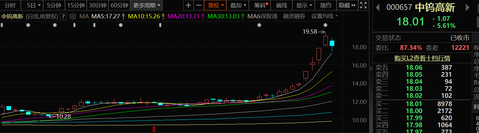 在经历了此前的八连涨之后,中钨高新7月28日的股价出现下跌,截至28日收盘,中钨高新跌5.61%,报18.01元/股。