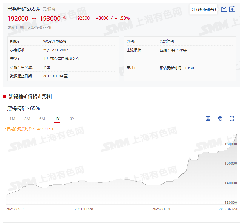 据SMM最新报价显示,7月28日,黑钨精矿(≥65%)延续了自7月14日以来的上涨趋势继续上行,其价格28日为192000~193000元/标吨,均价报192500元/标吨,较其前一交易日上涨1.58%。黑钨精矿(≥65%)7月28日192500元/标吨的均价,与2024年12月31日的均价142750元/标吨相比,其均价今年以来上涨了49750元/标吨,涨幅为34.85%。对于钨的后市,钨价短期有望在供应偏紧以及战略资源属性的支撑下继续偏强运行。不过,钨下游倒挂严重,市场对高价货源接受程度有限,市场成交量较前期出现萎缩,市场情绪转向谨慎,后续还需聚焦需求能否如期释放,倘若终端需求未见明显改善,或将限制钨价的涨幅。