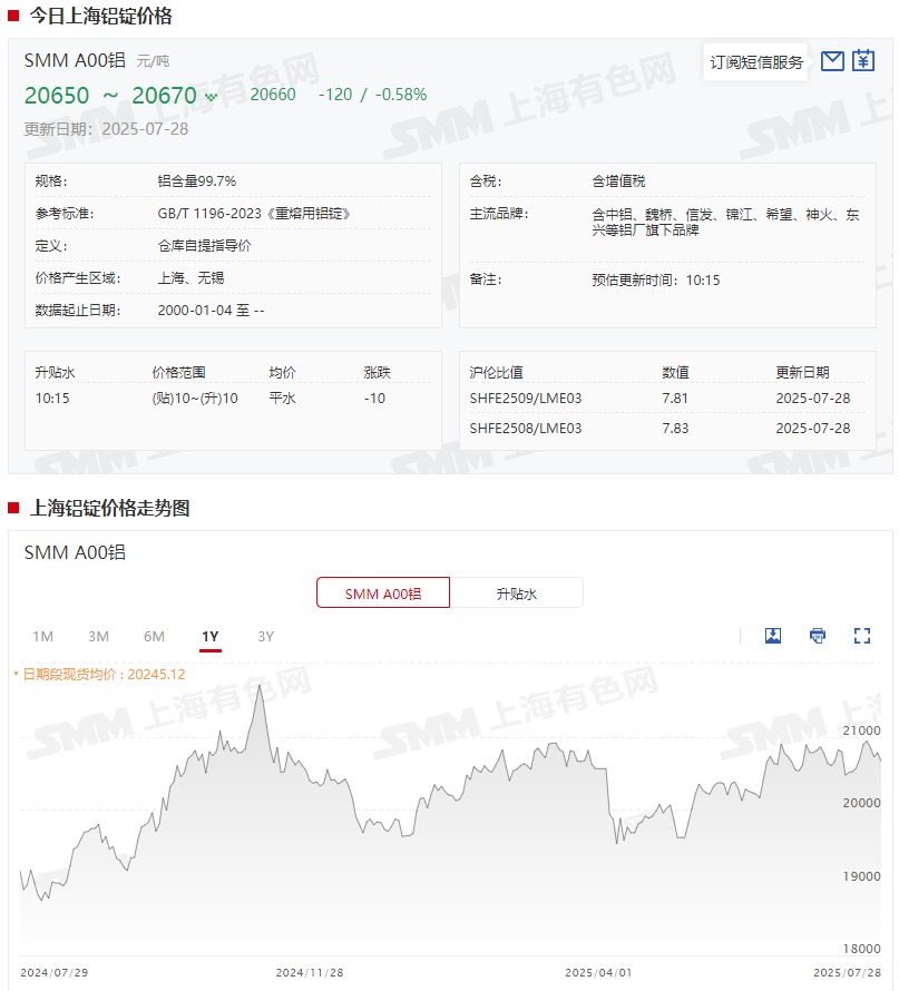 据SMM了解,一季度,国内基本面好于往年淡季表现,给予铝期现价支撑;二季度,中美国税博弈加剧,铝期现价暴跌,但回顾走势可见,市场情绪消化后,铝价反弹迅速,韧性仍存,叠加5-6月淡季铝锭社库超预期去化,铝期现价更是淡季强势走高,表现亮眼。 整体来看,2025上半年铝价重心呈现震荡抬升的趋势,2025上半年现货铝均价20318元/吨左右,较2024上半年的19801元/吨上涨2.6%。