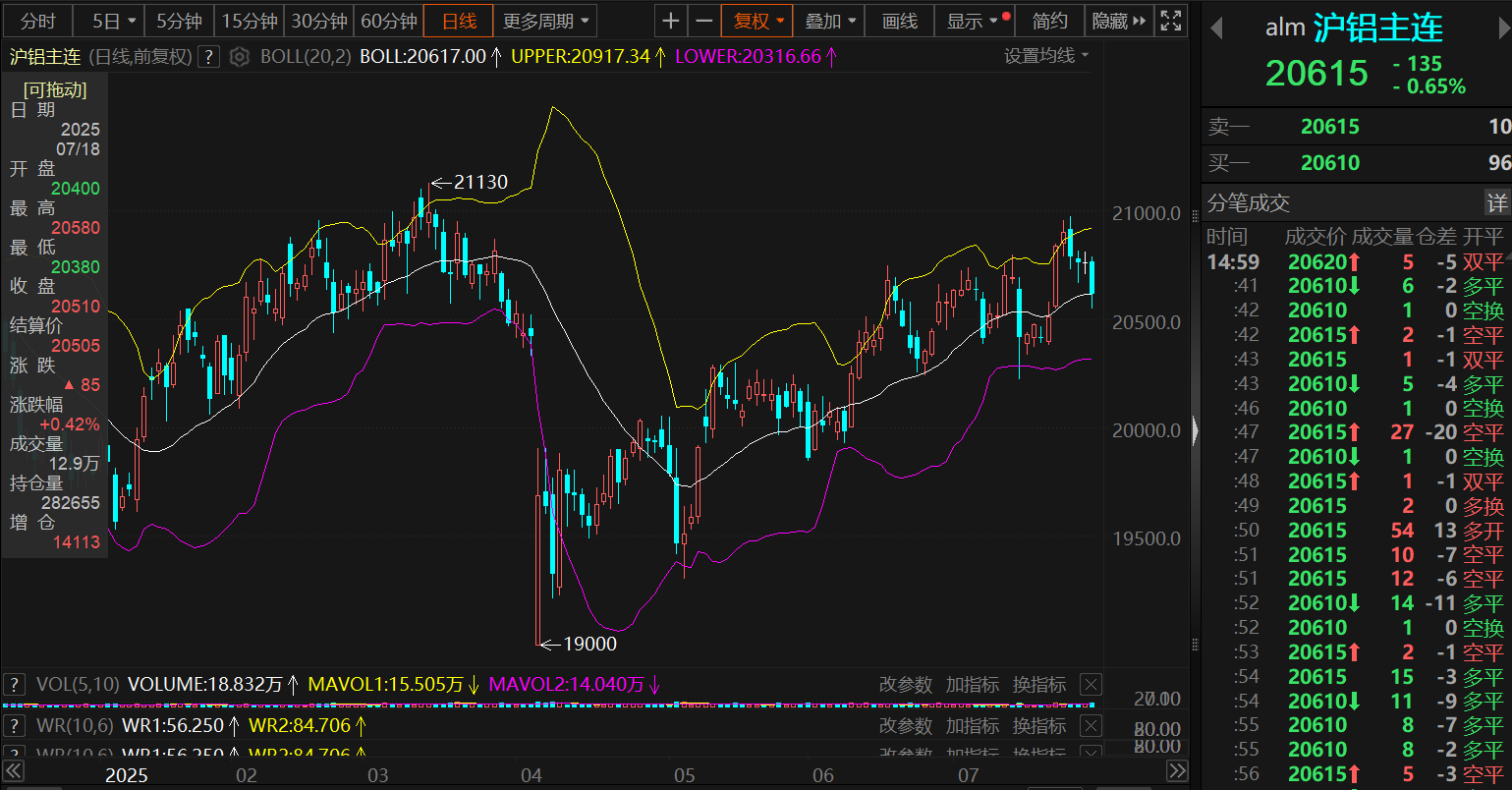 铝价方面,上半年沪铝价格呈现V型走势,4月7日一度跌至年内最低点19000元/吨,随后触底反弹,截至6月30日收盘,沪铝主连报20580元/吨的价格,半年线涨幅达3.99%。