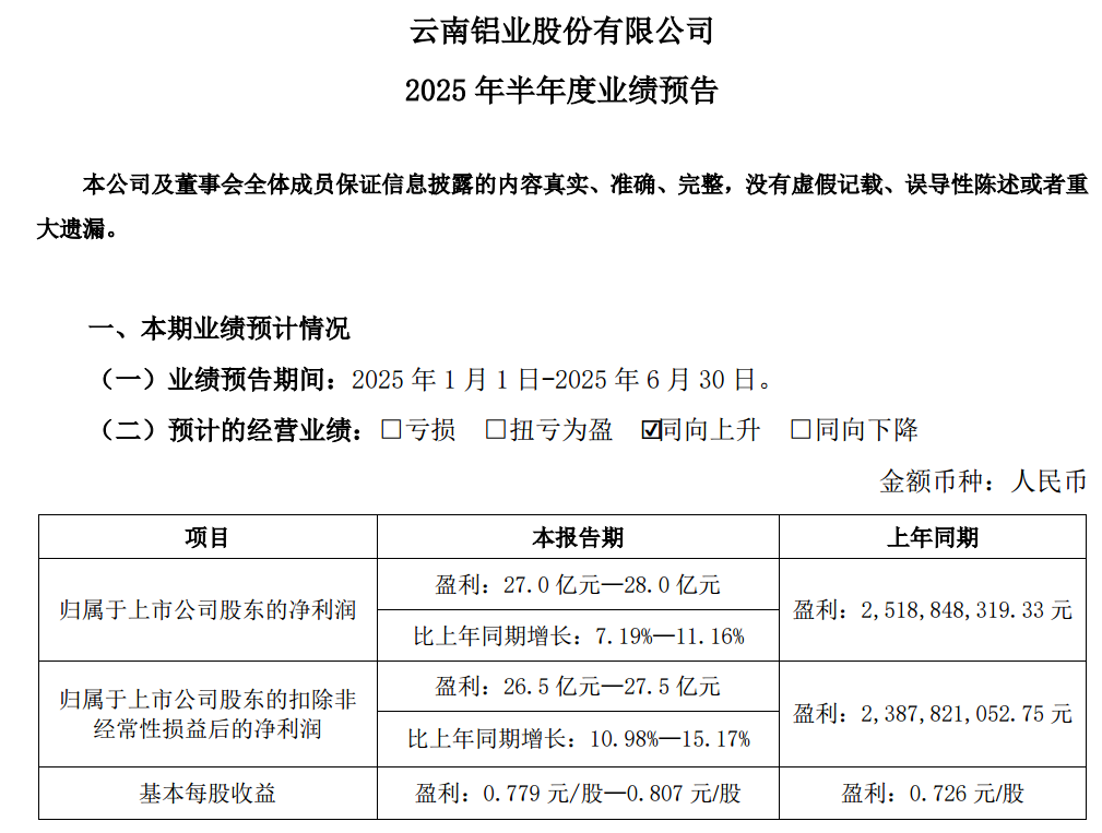 SMM 7月28日讯:7月9日,云铝股份发布了其2025年上半年业绩预告,其中提到,公司上半年归属于上市公司股东的净利润或在27.0 亿元— 28.0 亿元,较去年同期增长7.19% — 11.16%。