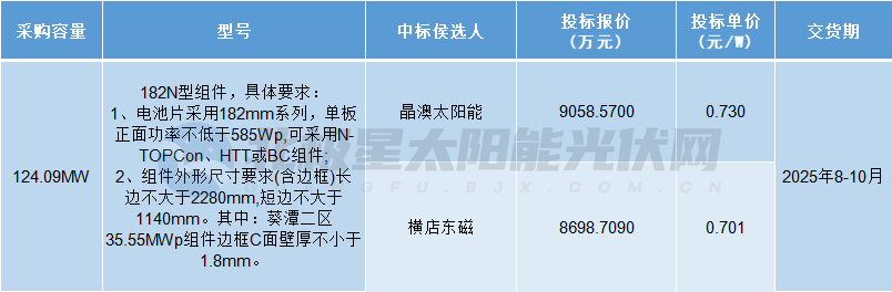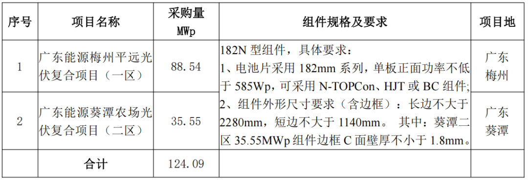 根据招标公告,此次采购包括广东省电力开发有限公司及其子公司投资建设的两个光伏项目,采购总量暂定124.09MWp,组件规格要求为182N型组件单板正面功率不低于585Wp,可采用N-TOPCon、HJT或BC组件,交货时间要求2025年8-10月。