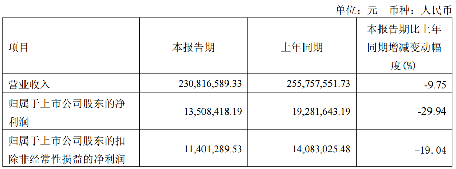 三祥新材发布的2025年第一季度报告显示:公司实现营业总收入2.31亿元,同比下降9.75%;归母净利润1350.84万元,同比下降29.94%;扣非净利润1140.13万元,同比下降19.04%。