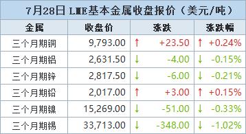 伦敦时间7月28日17:00(北京时间7月29日00:00),LME三个月期铜上涨23.5美元,或0.24%,收报每吨9,793.0美元。