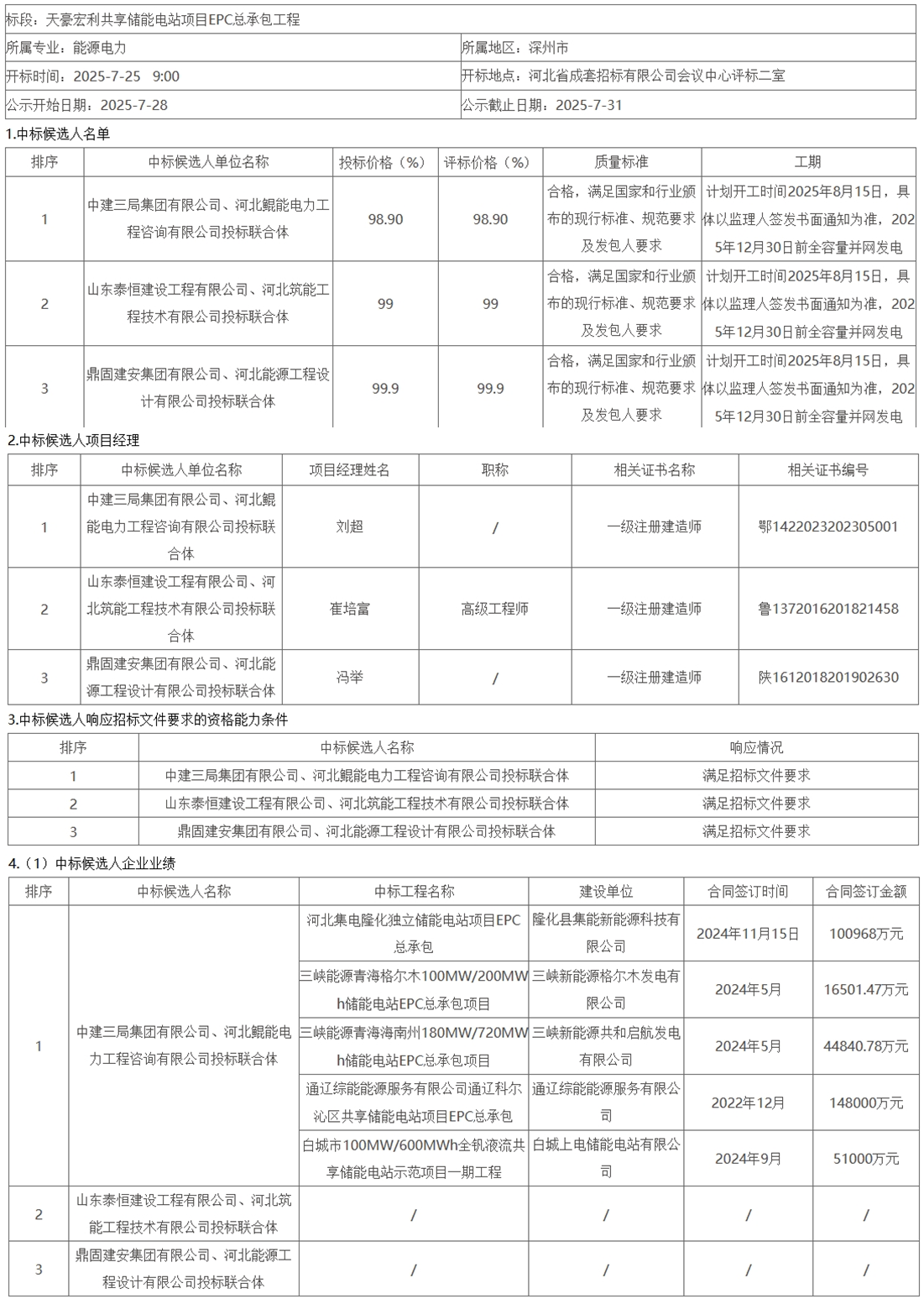 第一中标候选人为中建三局集团有限公司、河北鲲能电力工程咨询有限公司投标联合体,投标费率98.90%;