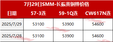 【SMM价格】2025年7月29日长振黄铜棒价格