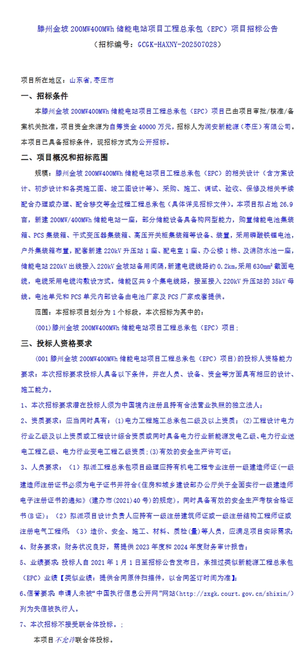7月28日,润安新能源(枣庄)有限公司发布滕州金坡200MW400MWh储能电站项目工程总承包(EPC)项目招标公告。项目位于山东省枣庄市,项目资金来源为自筹资金40000万元,折合单价1元/Wh。