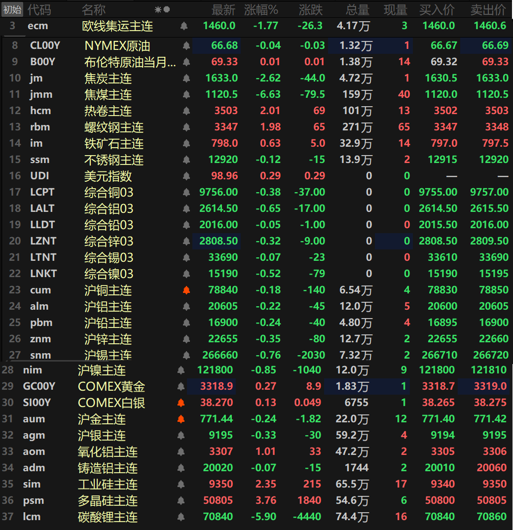 此外,碳酸锂主连跌5.9%,工业硅主连涨2.35%,多晶硅主连涨3.76%。欧线集运主连跌1.77%报1460。