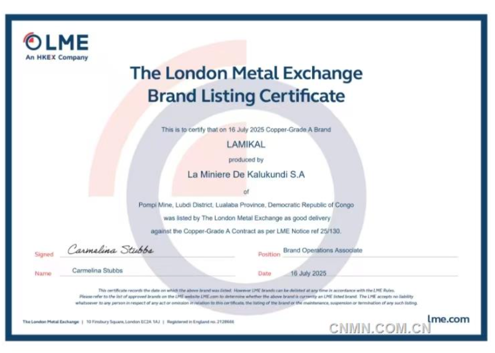 2025年7月16日,伦敦金属交易所(LME)发布公告,北方矿业有限责任公司所属刚果(金)拉米卡股份有限公司生产的“LAMIKAL”牌阴极铜,正式通过LME A级认证注册。