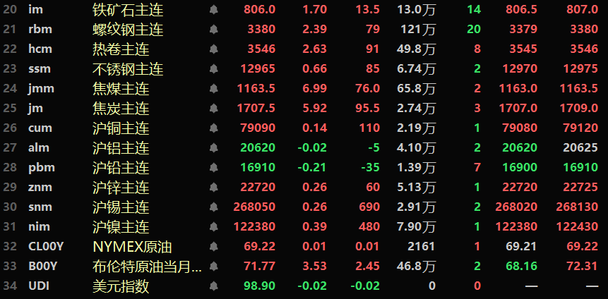 隔夜黑色系均飘红,铁矿涨1.7%,不锈钢涨0.66%,螺纹钢涨2.39%,热卷涨2.63%。双焦方面:焦煤涨6.99%,焦炭涨5.92%。