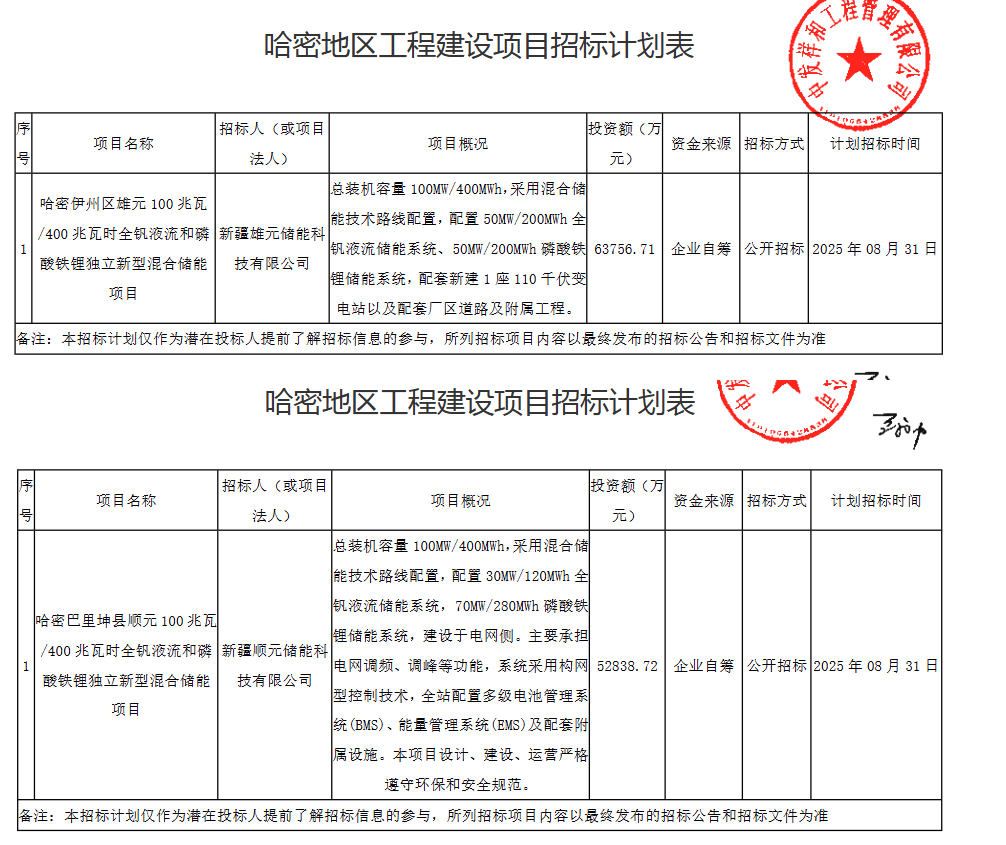 其中,哈密伊州区雄元100MW/400MWh全钒液流和磷酸铁锂独立新型混合储能项目招标人为新疆雄元储能科技有限公司,为北京中拓能数智科技有限公司旗下。项目采用混合储能技术路线配置,配置50MW/200MWh全钒液流储能系统、50MW/200MWh磷酸铁锂储能系统,配套新建1座110千伏变电站以及配套厂区道路及附属工程。