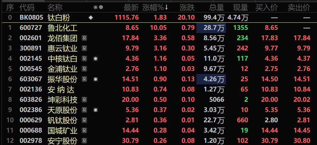 市场对资源品行业“反内卷”政策预期持续升温;随着环保政策趋严与行业整合加速,落后产能出清预期增强,供给端压力逐步缓解;尽管钛白粉价格仍处低位,但7月上游硫酸价格出现显著上涨,既强化了成本端支撑,也缓解了市场对价格进一步下跌的担忧,带动钛白粉价格触底反弹预期升温;同时,行业减产持续推进叠加传统需求旺季临近,市场对后续供需改善的信心不断增强等带动钛白粉概念股7月30日开盘走强,截至7月30日9:53分,钛白粉概念指数涨1.83%,个股方面:鲁北化工涨停,龙佰集团、惠云钛业以及中核钛白等涨幅居前。